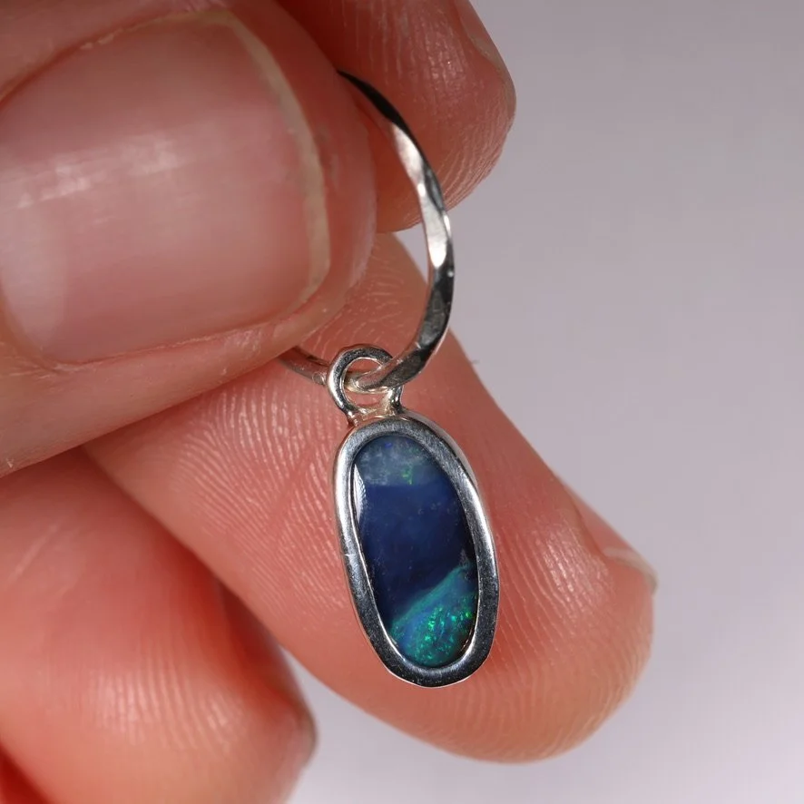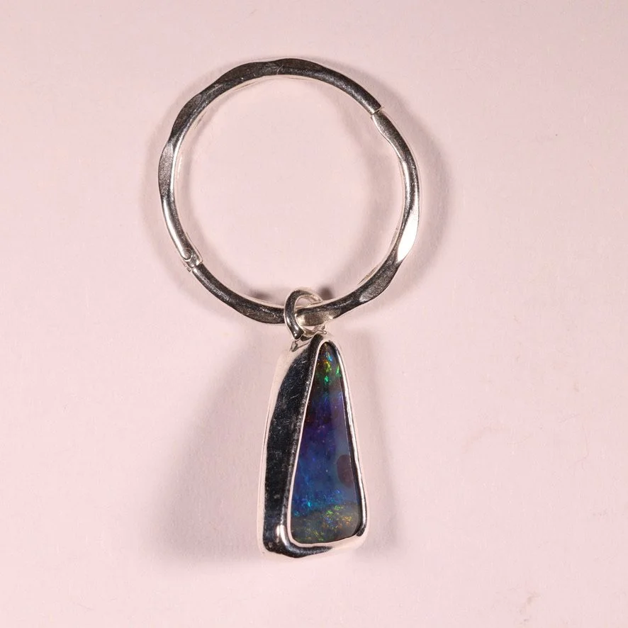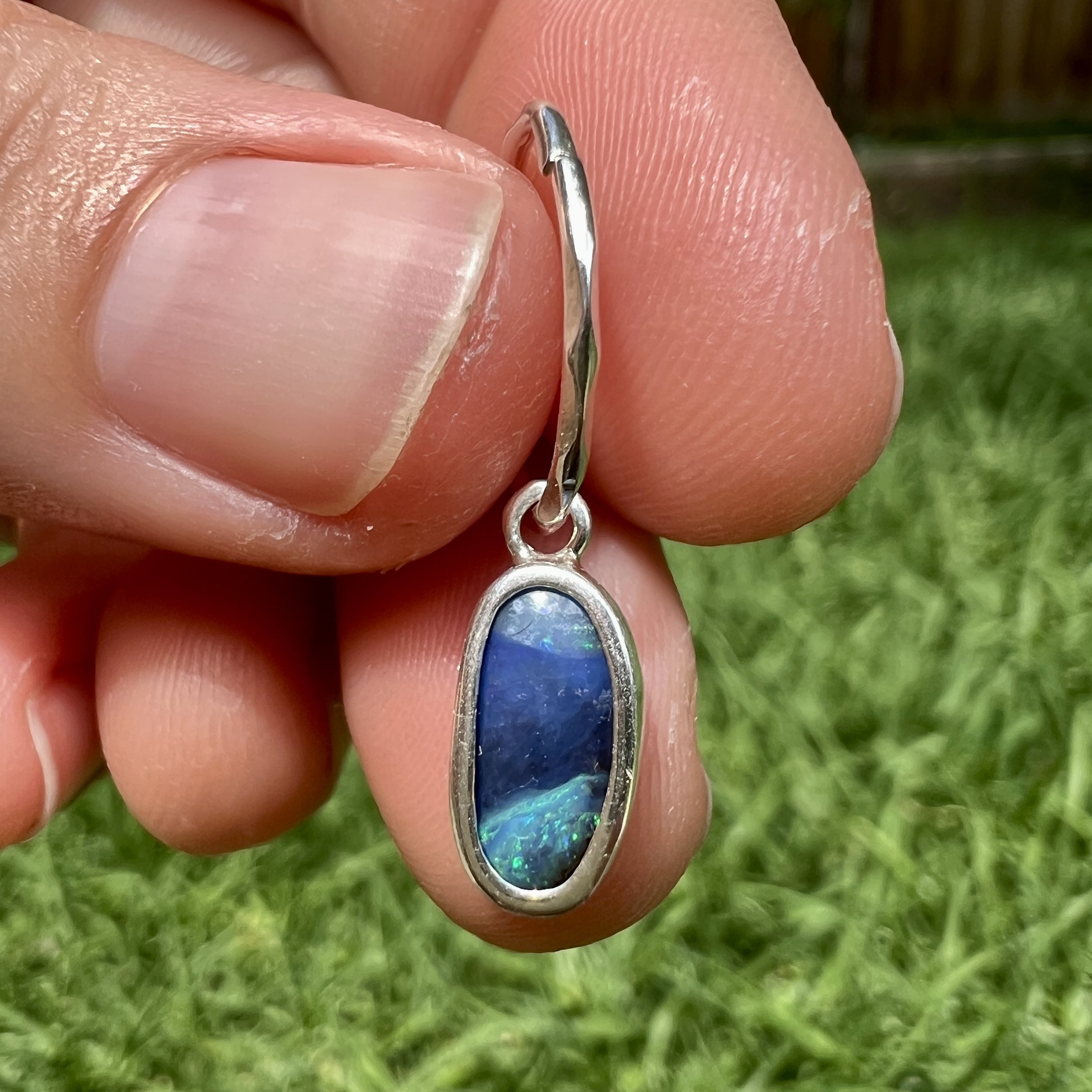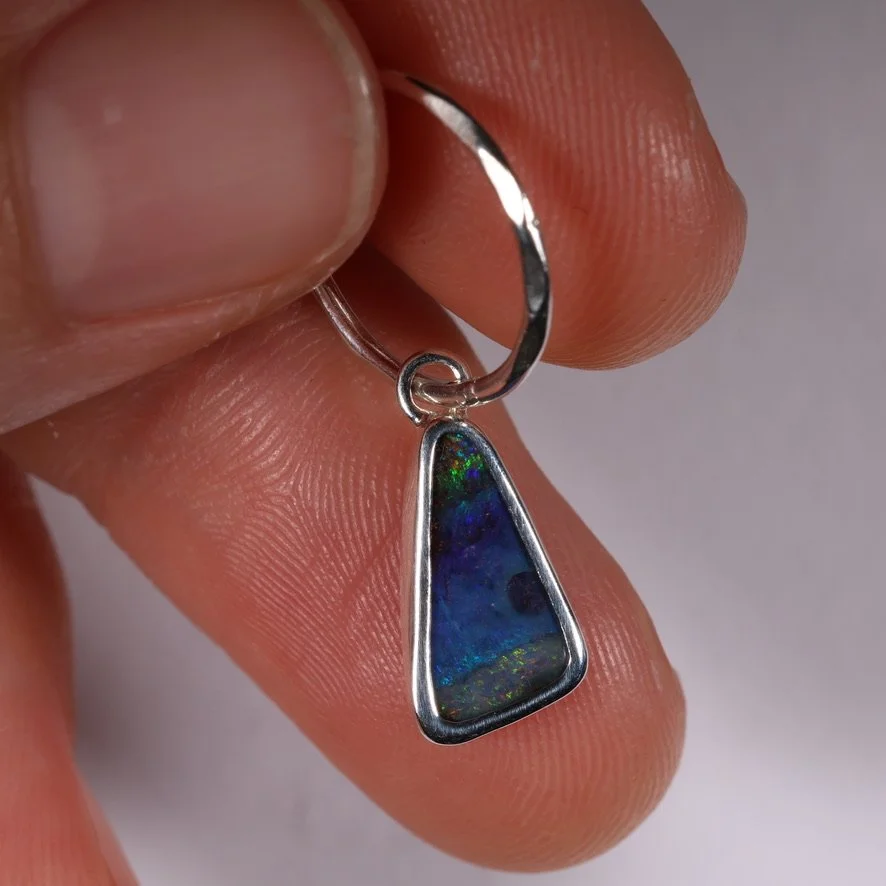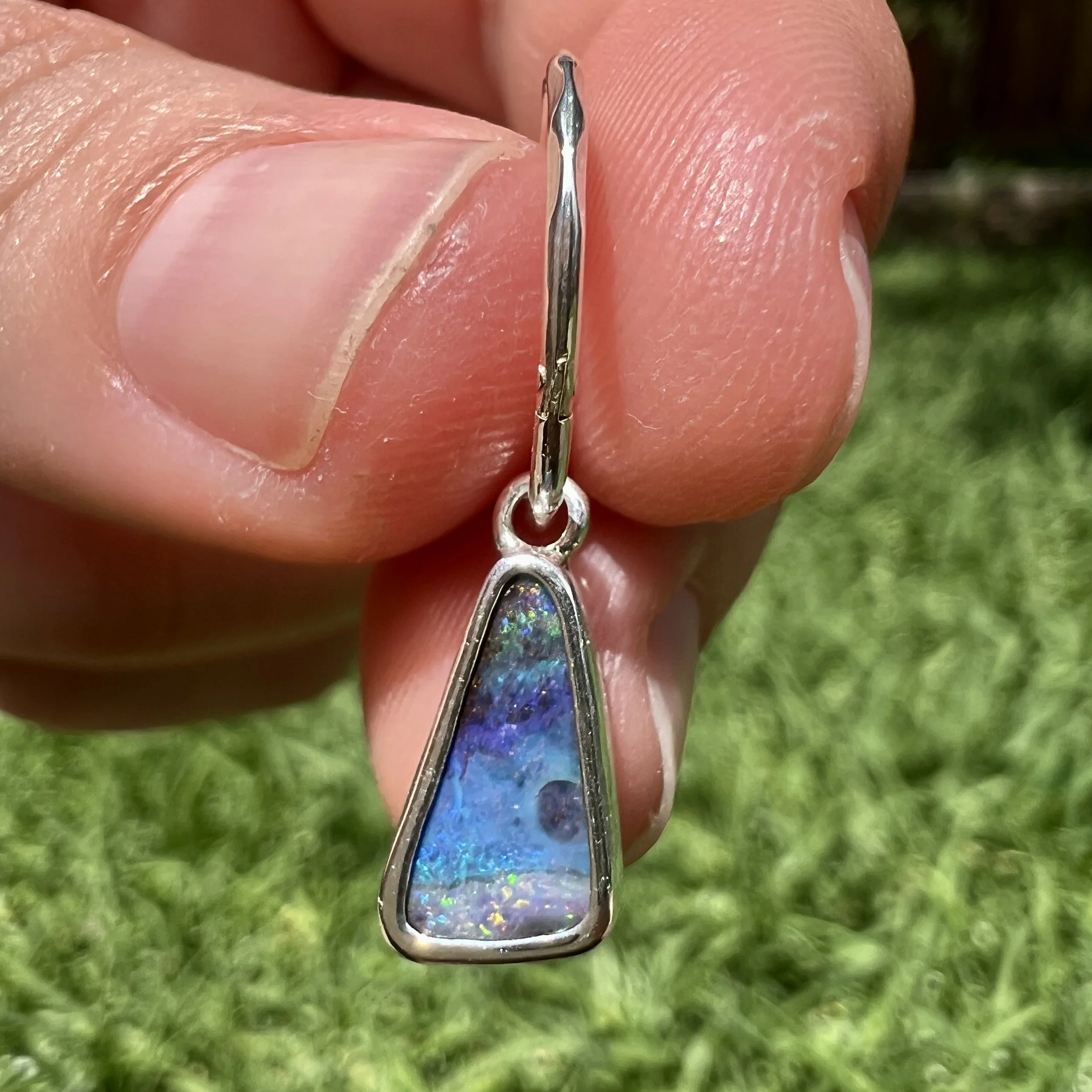 Single solid Aussie boulder opal set in .925 silver with a 14mm faceted sleeper earring.