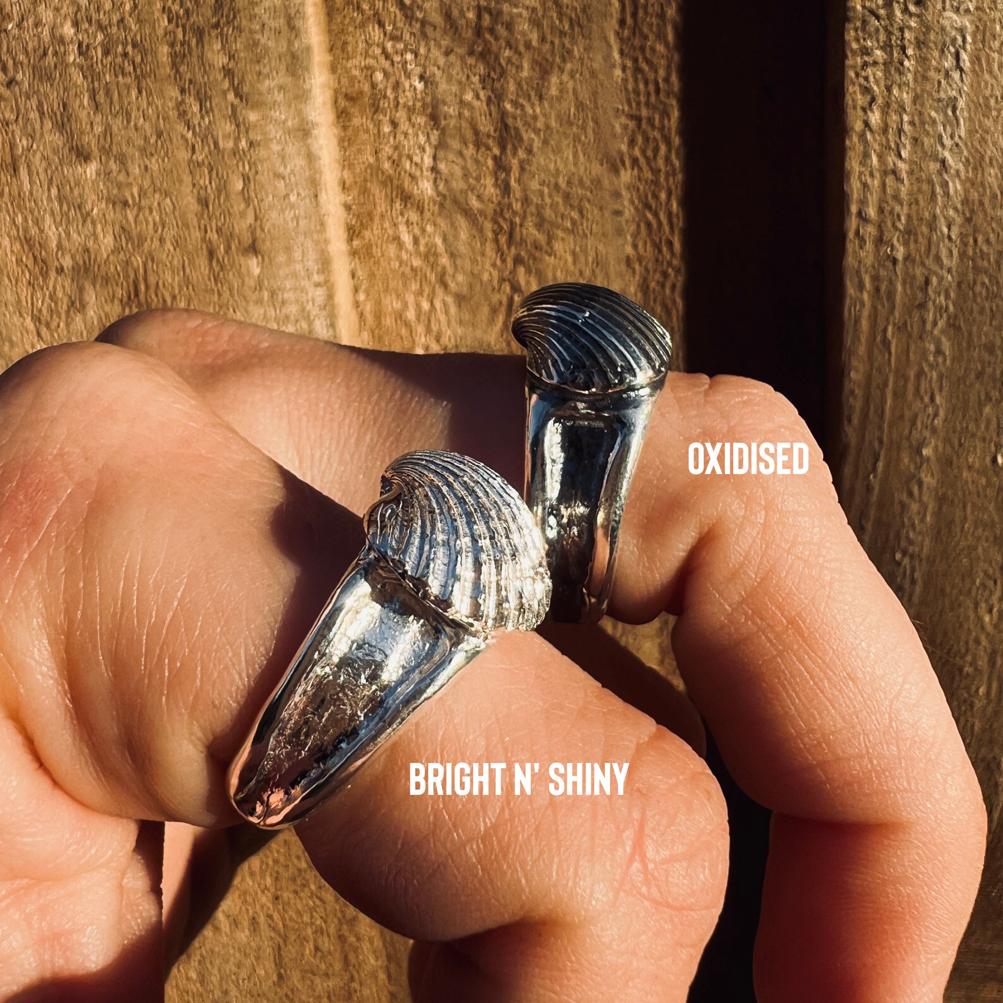 Choose from the small or medium shell, and oxidised (blackened details), or bright shiny silver.